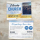 Ett attraktivt vykort för professionell som är underbart lämpat för kyrkliga evenemang, men som är tillräckligt allmänt tillgängligt för alla evenemang eller konferenser. På framsidan finns en baksida i himlar, med guld-beröring och rosett band överallt, och en redigerbar fyrkantig bild på framsidan. All information är redigerbar på vykortet, inklusive informationen om biljett i cirklarna. Teckensnitt färg kan ändras i redigeraren.