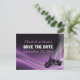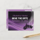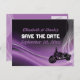 Lila vykort för biker bröllop spara datum, med en motorcykel på abstraktens lutande lila, svart bakgrund och vit maska. Lite inslag från Clipartandfonts.com.