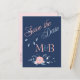 vykort för och blå bröllop spara datum, med motiv för blommigt och monogram för personlig, namn, datum och texter. Baksidan är färg.