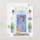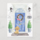 Meddela din ny adress med vår snyggt med en brant pudel, blå ytterdörr, välkomstmatta, skiffertecken, toparies och en blommigt krans på en grått tegelbakgrund.