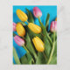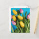 Vacker rosa och gult vår-tulpaner på blått vykort