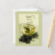 vykort för rosterisk olivolja med pitcher med olivolja med basilika löv i den, och utsökta svarta oliver med chives löv som accentuerar dem, allt i form av mjölkfärgstift