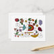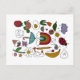 Det här vykortet innehåller slumpmässiga objekt i roligt färg för den nostalgiska känslan från 1980 bok. De söta små illustrationerna är jordgubbsbär, sköldpadda, stekt ägg, tulpaner, löv, regnmoln, ladybug, sol, chokladkaka för chip, båt, bananer, kopp, ballong, daisy, gult, anka eller gås, svamp, stjärna, glass krämkon, fjäril, paraply, regnbåge, kuvert, tal bubbla med orden "Hej", och en kartong med mjölk. Konst skapat av Tracy Lopez.