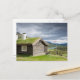 Vykort med en sovande tak-loghytt med en syn på en dal i Jotunheimens nationalpark under en mörk himmel i Norge.