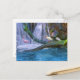 Bilden av ett tropiskt vattenfall innehåller tre fåglar: En rosa flamingo och två vita ibises. Det är ett underbart vykort.