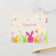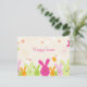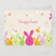 Det här söta Påsk-postkortet har en grå polka dots-bakgrund med mycket mjuk orange och vita blommor. Det finns några fjärilar som flyger högst upp. Vid grund finns det några söta, knivskallar som pockar upp som är skarpt färgad med rosa, grönt och orange. Glad påsk står överst. På baksidan finns samma gräddpolkadoter mönster. Den lämnas tom utan något meddelande så att du kan skriva in den hemma eller anpassa den själv innan du köper den.