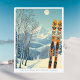 Hej från de snöiga bergen i Revelstoke British Columbia Kanada! Vi hoppas att du har en underbar skidsemester. Detta vykort visar ett vackert blågrått bergslandskap med retro-skidor i ett orangefärgat tribal-mönster.