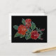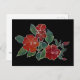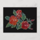 Hibiscus blommar. Röda blommor med grönt löv (delar av bilden som skisseras i beige, ge ett texturerat utseende) på svart bakgrund. Hibiscus-bild som tagits från den ursprungliga silke-målningen av Susan Lilly.