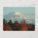 I höstfotot av Mt. Rainier, som stiger 14 411 fot över Puget Ljud ungefär vid miles i sydöstra Seattle, WA, visar berget sin höst färger. Mörk grönt, grönt träd går med den vackra, rödaktiga och guld-leaverade, lövdaktiga träd dans och böjer sig i förgrunden för en kraftig vind. Vämparna med rökiga moln blåser över bergets överkant och fot mot ett lätt blå himmel. Om du tittar noga kan du se att några svarta fåglar kastas runt mitten till nedre högerna av fotografiet. Copyright Gail Storrs 2007.