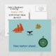 Meddela en kommande flytt av privatperson eller företag med detta nautiska vykort. Två segelfartyg med kompass och valstjärt ovanför texten "Ny hamn framöver ...". Anpassa information på meddelandesidan med Namn/datum för flytten/Adress/Kontaktinformation. Bra för seglingsrelaterade företag eller individer med nautiskt intresse.