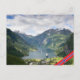 Fotovykort som visar det storslagna landskapet vid Geirangerfjorden och byn Geiranger mellan bergen i Norge med en norsk flagga.