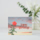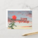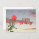 En ensam rosa ros på en bladrik grön stjälk hålls upp mot en solnedgångshimmel. Gyllene himmel i botten och blågrå himmel i toppen. Rosa och gråa moln är utspridda över himlen. "Grattis på födelsedagen" står i rosa text med svart skugga (kan redigeras till din önskan).