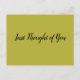 Klassi, men enkelt vykort för de tillfällen då man har en specifik fleeting tanke på någon och vill "snabbt", låt dem veta. Det kommer säkert att krävas ett mobilt samtal, men detta speciella uppehälle varar hur länge mottagaren vill. Reach ut och överraska någon med din omtänksamhet! Det finns massor av färg och många olika budskap att välja mellan.