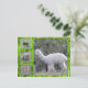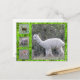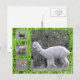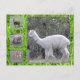 Alpacka och får. På vänster sida av kortet finns tre små bilder av alpacka (överst och nederst) och får (i mitten). Huvuddelen av kortet visar en större bild av en vit alpacka. Alla bilder är inramade med ljusgrön gräs med daggdroppar.
