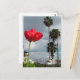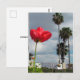 Vallmoen strävar efter att nå molnen likt palmerna i bakgrunden. Röd blomma sträcker sig upp mot de mörka molnen som täcker himlen ovanför flera palmer. Solljuset spelar på undersidan av de röda kronbladen.