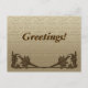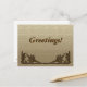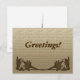 Två grafiska bilder av lövrika vinkeljärn i de nedre hörnen. Anpassa texten som visas ovan (standard är "Hälsningar!"). Bakgrunden är en linnetextur i beige.
