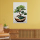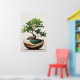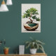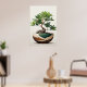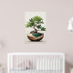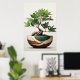 Wabi-Sabi-konst av en kruvad bonsai träd med pulserande grönt löv och en vriden trunk visas med stor detaljrikedom. Plattan har en snurrande design med flera färgader som kompletterar den ekologiska formen i träd.