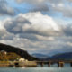 En åsikt från Barmouth-hamnen om bergen, flodmynningen och järnvägsbron. Wales UK.