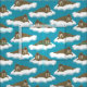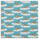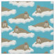Detta illustrerade tyg har en hel del valrossar över mönster flytande på isberger eller lakan av is. De realistiska stil-valroillustrationerna ställs in mot en turkosblå färgad bakgrund.