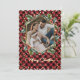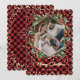 Elegant rött och guld-fotojulkort med ett geometriskt foto ram omgivet av en vattenfärgandekrans på en röd och svart buffelbakgrund. Anpassa enkelt dessa röda julkort med din bild, text och familj namn.