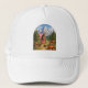 This whimsical illustration features a pink winged fairy hiking a trail surrounded by red toadstool mushrooms, pines and towering mountains. The storybook-style art captures a love for nature, adventure, and magical daydreams. This cute wanderlust hat is perfect for those who love fairycore style, cottagecore art, and fairytale creations that feel nostalgic and magical. | This design is available on multiple hat styles. Choose a trucker, dad, snapback, or bucket hat from the Product Style menu above.