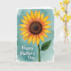 This card features a stylized flower centered in the design, with a dark brown, seed-like core textured to feel deep and detailed. Wide petals fan outward in a warm gradient, shifting from sunny yellow at the tips into softer orange and a gentle rosy blush closer to the center, like a tender glow held close ❤️. A sturdy deep green stem rises from below, and a single leaf leans out to the side, adding a calm, balanced touch that feels quietly affectionate. Behind it all, the background is a teal wash with a watercolor look, showing soft variations in tone and slightly uneven edges like open sky. In the lower left corner, a short message appears in flowing white lettering, standing out clearly against the teal. The overall layout leaves plenty of breathing room around the bloom, giving the scene an easy, friendly warmth 🌼. The petals show yellow on the outer edges fading into orange and blush near the dark brown center, with the white text anchored at the lower left.