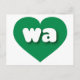 Det här vykortet har ett dynamiskt hjärta för grönt som innehåller det feta, vita, rundade nedre brev wa, en lekfull förkortning för Washington, det gröna tillståndet. Kortets baksida är tom och väntar på dina handskrivna känslor eller anpassade texter.