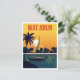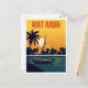 Illuminate your space with this gorgeous vintage travel poster style postcard featuring Wat Arun, the Temple of Dawn, in Bangkok, Thailand. The iconic prang (spire) is bathed in the dramatic, golden light of a sunset, silhouetted against a vibrant orange sky. A traditional longtail boat rests on the Chao Phraya River in the foreground, framed by a palm tree. This design perfectly captures the exotic beauty and tranquility of the Thai capital. It's ideal for sending greetings, collecting retro Southeast Asian art, or decorating a travel-themed space.