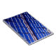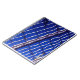 Color photograph of metal fence reflected on water w/ blue sky background.