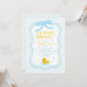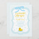 Baby blue gingham baby shower with a hand drawn bow. Water droplets frame a rubber duck surrounded by bubbles