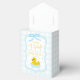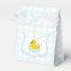 Baby blue gingham baby shower with a hand drawn bow. Water droplets frame a rubber duck surrounded by bubbles