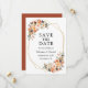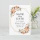 Modern Elegant Watercolor Blommigt Save The Date Förlovning Bröllop annoncement Card innehåller vackra höstblommor på ett guld-geometriskt ram. Orange ro, persiko-ro, gyllene ro, rosa ros, plommonsuckningsmedel, vit ros, eukalyptus löv och andra botaniska grejer. Terracotta tillbaka.