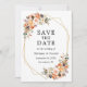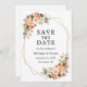 Modern Elegant Watercolor Blommigt Save The Date Förlovning Bröllop annoncement Card innehåller vackra höstblommor på ett guld-geometriskt ram. Orange ro, persiko-ro, gyllene ro, rosa ros, plommonsuckningsmedel, vit ros, eukalyptus löv och andra botaniska grejer.