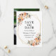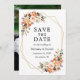 Modern Elegant Watercolor Blommigt Save The Date Förlovning Bröllop annoncement Card innehåller vackra höstblommor på ett guld-geometriskt ram. Orange ro, persiko-ro, gyllene ro, rosa ros, plommonsuckningsmedel, vit ros, eukalyptus löv och andra botaniska grejer. Foto bakåt.