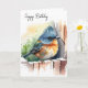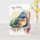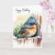 Späd vattenfärgsfågel på ett trästaket för födelsedag. Texten kan redigeras.