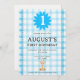 Perfect for baby's first birthday, this invite features an adorable giraffe with a charming watercolor check background.