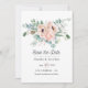 Bohemian bröllop spara datum kort med eukalyptus löv och blommigtar i accenter för rosa och sage grönt.