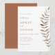 Warm, organic, and effortlessly elegant, this watercolor botanical wedding invitation features a lush eucalyptus leaf stem in rich earthy tones of rust, terracotta, olive, and taupe. The stunning single-stem illustration runs the full height of the card, creating a dramatic yet understated focal point alongside clean, modern typography.