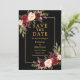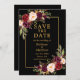 Elegant Watercolor Burgundy Blommigt Save Date Förlovning Bröllop annoncement Card omfattar burgundy ro, rosa ros, röd ros och botaniskt grönt på guld ram. Svart bakgrund.