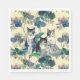 Paper napkins in a watercolor-style illustration of three black-and-white cats surrounded by lush, vibrant green foliage, with purple and pink flowers. The composition is dreamy and nature-infused, blending realism with fantasy.