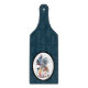 Söt skärbräda (som också kan dubbla som en karosseribräda) har illustration av vattenfärgsceller på vitt med svart gräns oval ram på mörk blått bakgrund