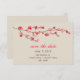 Ett enkelt, modernt bröllop spara datum med en vattenfärg inspirerade till en illustration av en gren av körsbärs blommar på framsidan. Röd och brun text. Bakgrunden är en djup skugga av benvitt. Leta efter matchande bröllopsinbjudningar och OSA kort på Jill's Paperie.