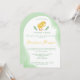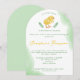 A lovely green and yellow watercolor baby shower invitation featuring Destei’s little yellow chick at the top framed by two green leafy branches. The intro text reads “A Little Chick Is Waiting To Hatch,” creating a sweet and memorable theme for the celebration. The green and yellow palette makes this design perfect for anyone who loves fresh, natural tones. Subtle watercolor washes along the edges add beautiful decorative detail. The name of the mom to be appears in yellow while the remaining text is in green, allowing her name to stand out in a stylish and elegant way. The other side of the card has a light green background color.