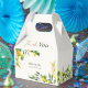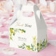 Fresh watercolor lemons and eucalyptus greenery wrap around this elegant gable favor box, with a “Thank You” script and customizable couple’s names and wedding date on the front panel. Perfect for holding cake slices, sweets, or small gifts, this citrus wedding favor box coordinates with a full lemon stationery suite for summer, garden, Mediterranean, Italian and citrus-themed weddings.
