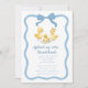 Celebrate the parents-to-be with this charming watercolor baby shower invitation featuring three adorable yellow ducklings splashing in playful puddles. This whimsical design is framed by a delightful wavy yellow border and topped with a sweet, hand-painted yellow bow, making it perfect for a gender-neutral or 'splashing into parenthood' theme.