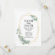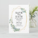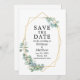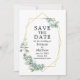 Modern Elegant Watercolor Eucalyptus Grey Förlovning Bröllop Announcement Save Datumkortet inkluderar eukalyptus löv på ett guld-geometriskt ram.