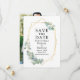 Modern Elegant Watercolor Eucalyptus Grey Förlovning Bröllop Announcement Save Datumkortet inkluderar eukalyptus löv på ett guld-geometriskt ram. Foto bakåt.
