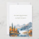 Meddela ditt kommande bröllop med det här hisnande "Spara datumkortet", som har ett fantastiskt vattenfärgande landskap som framkallar höstens sköna skönhet i bergen. I det mästerliga konstverket framställs stora, mistliga berg med toppar med snö i blå grått, och man bortser från ett stillastående sjö som på ett vackert sätt avspeglar den vibrerande miljön. Kusten brinner med det lysande färg av fall - orangar, gyllene och rik rostigt , troligen från decibel träd som aspen eller björk med sina karakteristiska, bleka vita trunkar, som på ett vackert sätt konstraheras av den blå grönten, vargrön gräs. Den mjuka, evokativa vattenfärgen stil fångar upp den mistala ambitionen och tillför en liten aning romantik och lugn. Elegantens typografi kompletterar den fantastiska teckningen, skapar perfekten för par för att planera ett fallbröllop, ett berg firande, eller de som verkligen uppskattar naturens skönhet.
