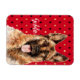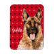 Snyggtens magnet har vattenfärgen porträtt stil illustration av tyska Shepherd hund på rödsvart och guld diamant harlequin-bakgrund. Anpassa med namn eller speciellt meddelande