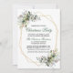 Elegant Vatercolor Greenery jul Party bjudande in omfattar vackra botaniska grönfiskar, eukalyptus löv, hullbär och annat vackert lövverk. Guld Geometric Ram.